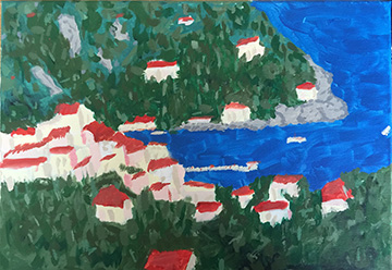 Here is a new painting that I have just finished. It is loosely based on the view from the incredible villa we stayed in on the Amalfi Coast. (Thanks again Cheryl!) You may or may not recall that I had decided that I was using too much of a paint-by-numbers approach and trying to paint within the lines. So I made a conscious effort here to paint in a freer way. I didn’t sketch out the design on the canvas first and decided to use only a pretty large flat brush and I didn’t worry too much about getting the perspective perfect, which the mathematical side of me likes to do. (I am always attracted to artwork that has a kind of mathematic underpinning. I should probably try that some time.) The one thing about painting this way is figuring out when to stop. (Before I would stop when all the spaces were filled.) I’m not sure that the final result is any better, but I think I find it more satisfying to paint in this way.